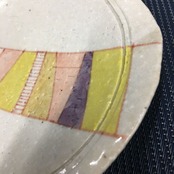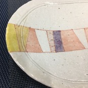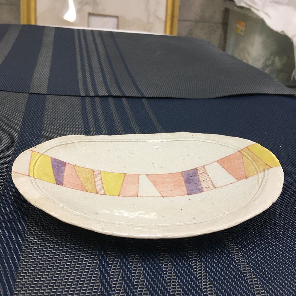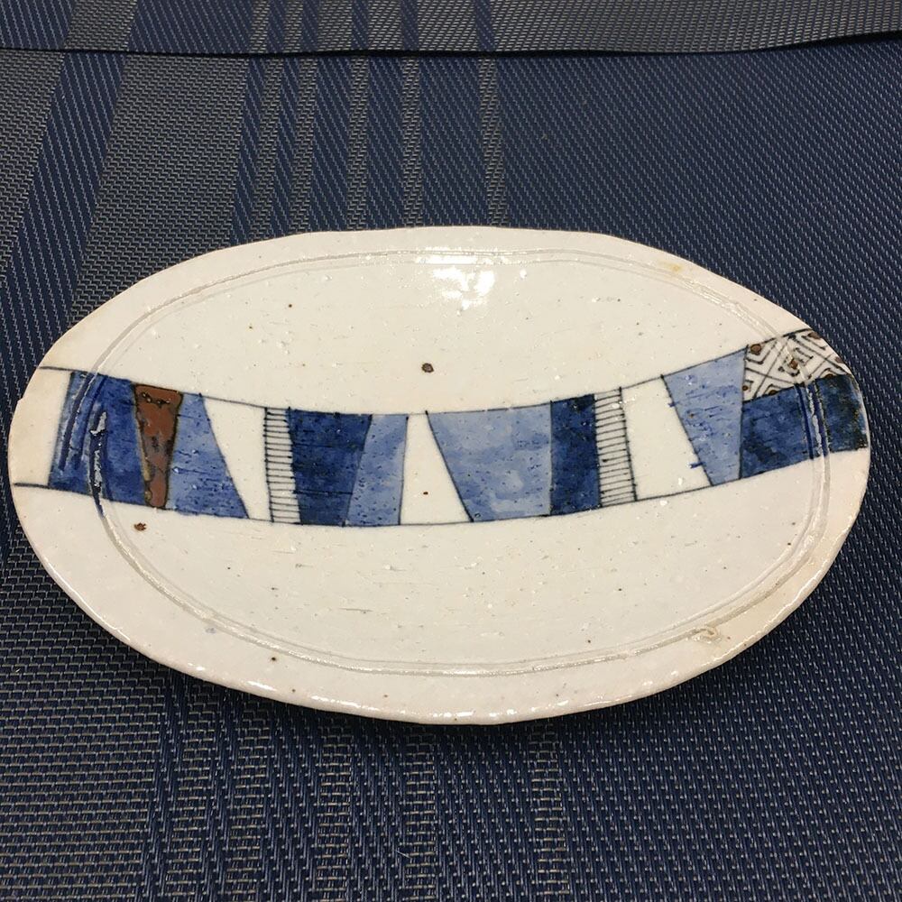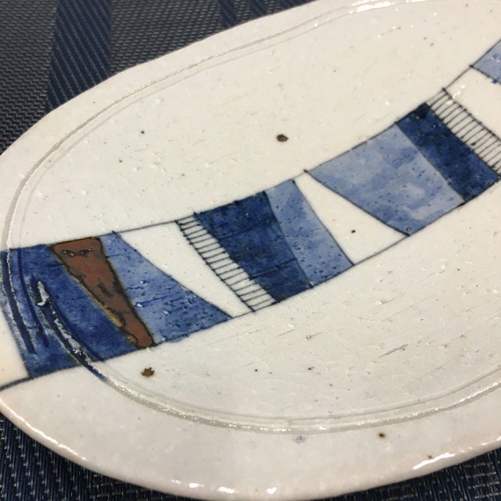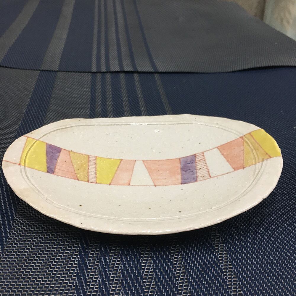 この楕円皿は、有田焼の伝統を活かした手描きの幾何学模様が特徴です。